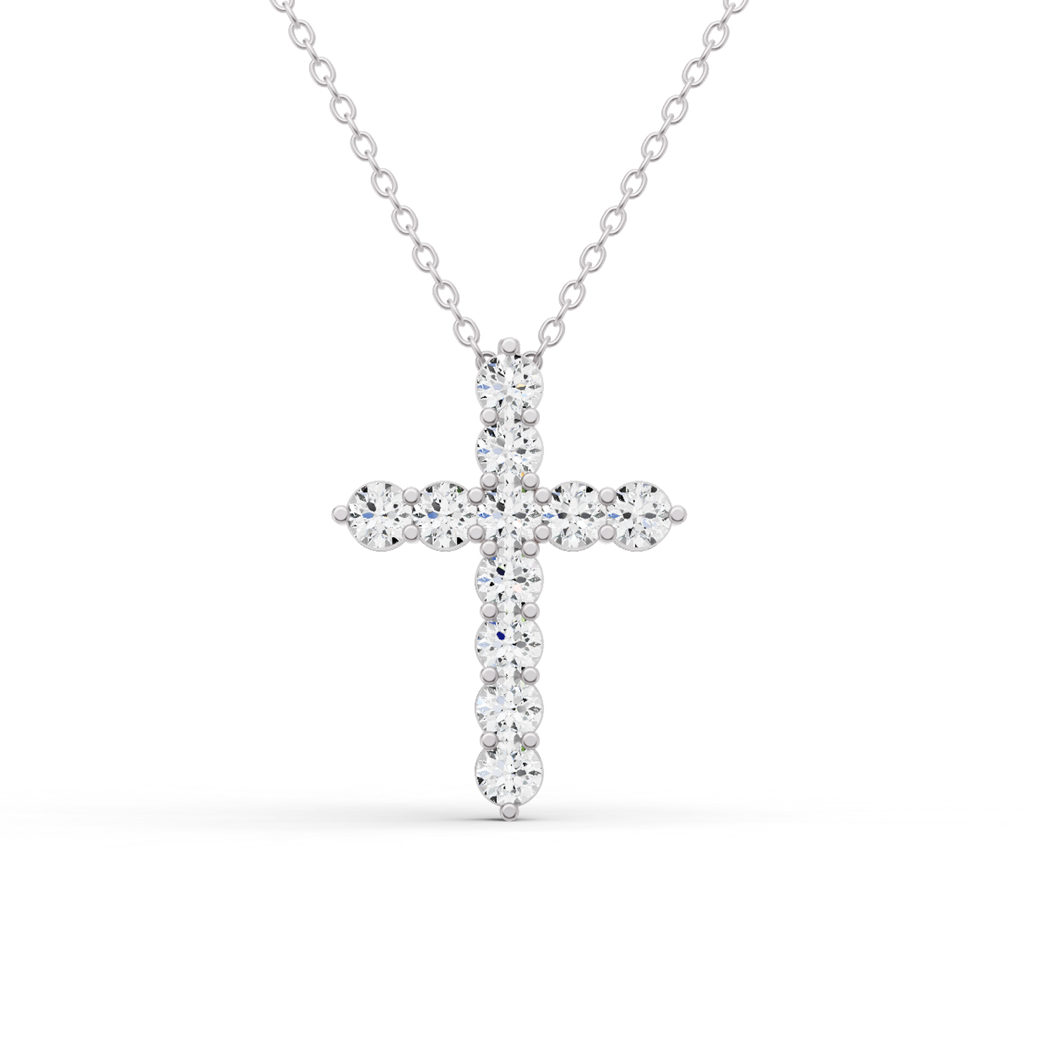 This stunning 2 or 3 CTW Round Lab Grown Diamond Cross Pendant features eleven beautiful stones, each securely held in a classic 4-prong setting. Crafted from luxurious 14K White or Yellow Gold, this pendant showcases diamonds with a color grade of E-F and clarity ratings of VS1-VS2, ensuring exceptional brilliance and clarity. Perfect for any occasion, this elegant piece symbolizes faith and embodies modern sophistication, making it a timeless addition to your jewelry collection.