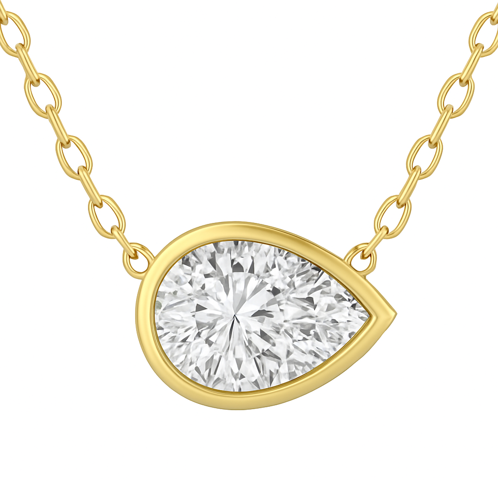 This 14k bezel yellow gold pendant with a .5 Ct. pear shaped single lab diamond. F color VS2 clarity excellent cut. 18 inch chain included. $599.00