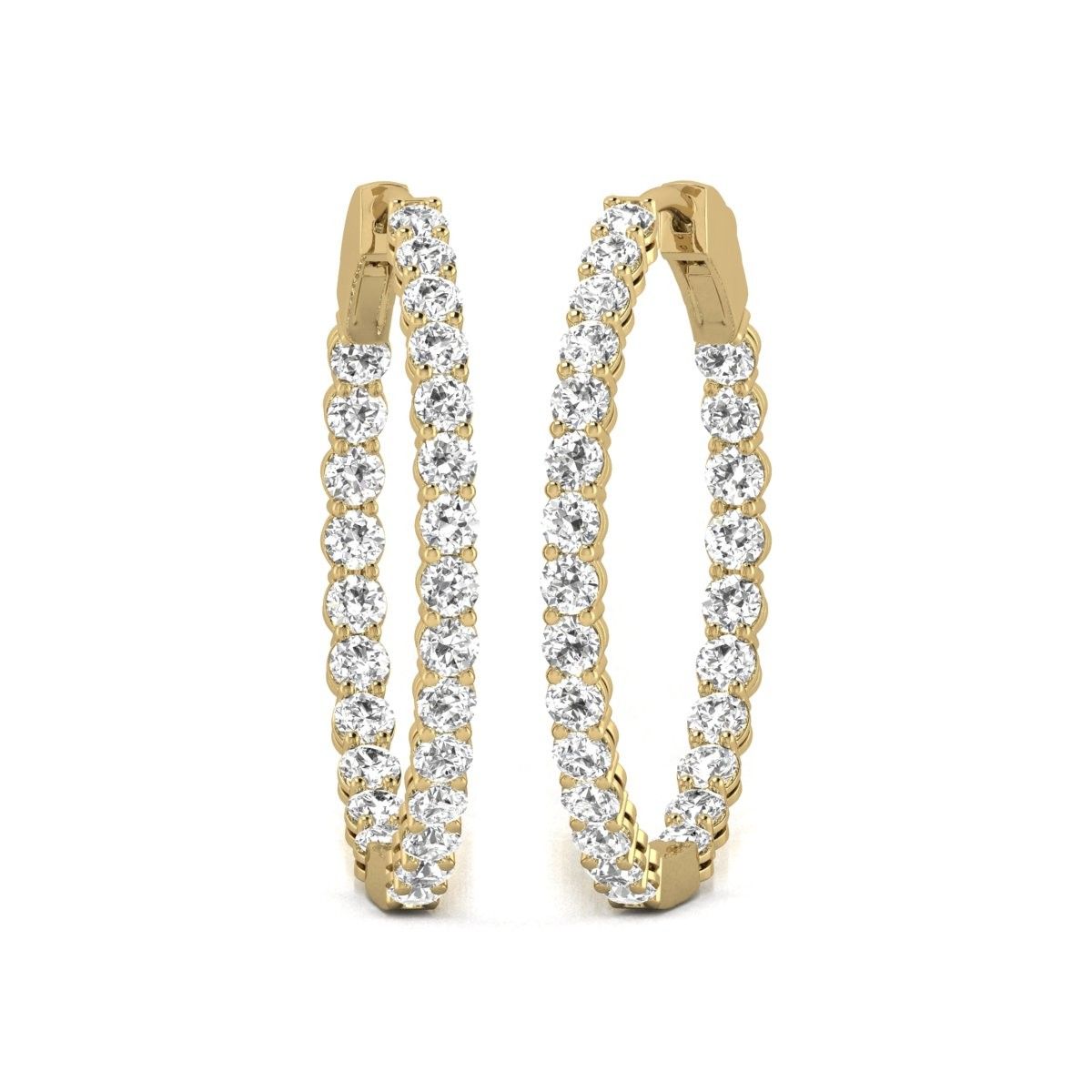 A stunning pair of hoop earrings feature 50 lab-grown diamonds with E-F color and VS1-VS2 clarity. These earrings are round-shaped and offering a classic and elegant hoop design with a modern twist. A perfect for adding a touch of glamour to everyday looks and special occasions.